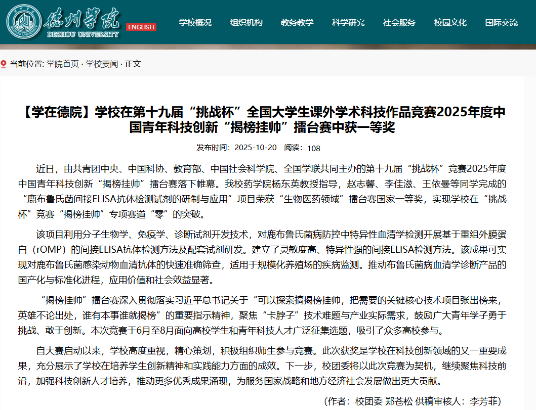 近日,由共青团中央、中国科协、教育部、中国社会科学院、全国学联共同主办的第十九届“挑战杯”竞赛2025年度中国青年科技创新“揭榜挂帅”擂台赛落下帷幕。必赢网站Bwin必赢网址杨东英教授指导,赵志馨、李佳滋、王依曼等同学完成的“鹿布鲁氏菌间接ELISA抗体检测试剂的研制与应用”项目荣获“生物医药领域”擂台赛国家一等奖,实现学校在“挑战杯”竞赛“揭榜挂帅”专项赛道“零”的突破。